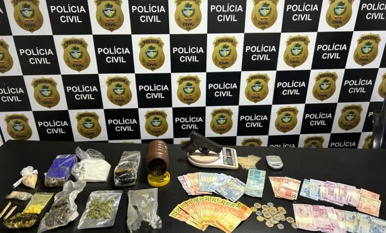 Em seguida, os policiais entraram na casa e encontraram grande quantidade de drogas, como maconha, dry, haxixe, skunk, crack e comprimidos de ecstasy. Além disso, localizaram um simulacro de arma de fogo, uma balança de precisão, embalagens plásticas e dinheiro espalhado sobre um colchão no chão.