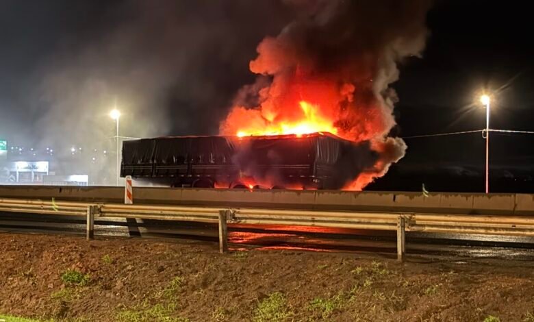 Carreta pega fogo na BR-050 e mobiliza bombeiros em Catalão