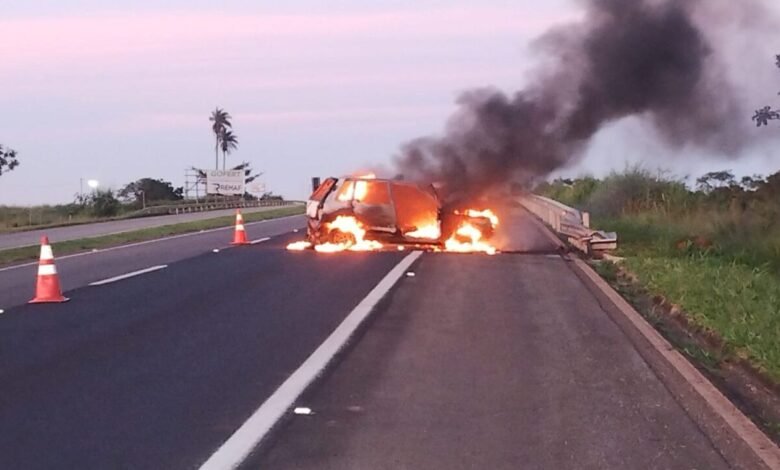 Carro pega fogo após acidente na BR-050 e motorista desaparece em Catalão