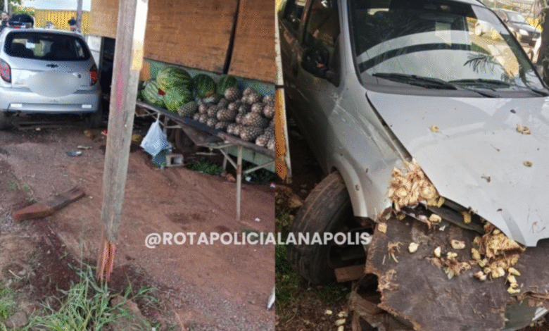 Carro perde controle e atinge barraca de frutas em Anápolis
