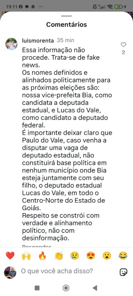 “Essa informação não procede. Trata-se de fake news. Os nomes definidos e alinhados politicamente para as próximas eleições são: nossa vice-prefeita Bia, como candidata a deputada estadual, e Lucas do Vale, como candidato a deputado federal. É importante deixar claro que Paulo do Vale, caso venha a disputar uma vaga de deputado estadual, não constituirá base política em nenhum município onde Bia esteja juntamente com seu filho, o deputado estadual Lucas do Vale, em todo o Centro-Norte do Estado de Goiás. Respeito se constrói com verdade e alinhamento político, não com desinformação”, disse Luiz.