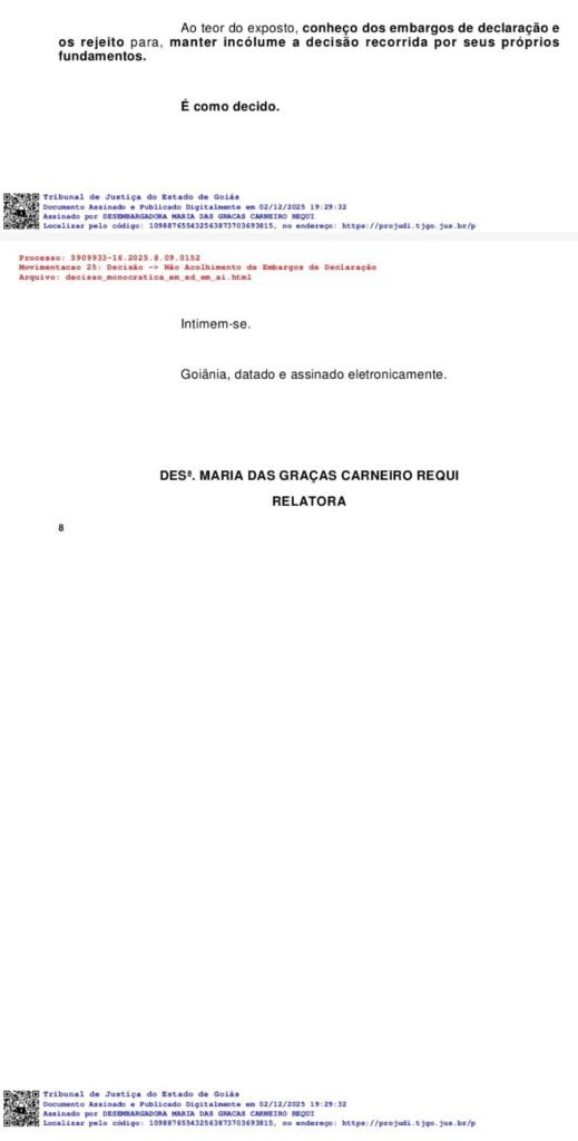 “Ao teor do exposto, conheço dos embargos de declaração e os rejeito para, manter incólume a decisão recorrida por seus próprios fundamentos”, diz.
