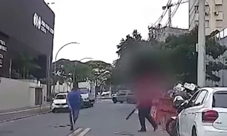 O homem se recusou e provocou o motorista: “Vai me tirar daqui no tapa? Vamos ver se você é macho.” A provocação foi o estopim. Os dois desceram do carro e começaram a trocar agressões. O vídeo mostra o momento em que o passageiro atinge o motorista com um soco. Em resposta, o condutor se defende com um balizador de trânsito e, em seguida, pega uma barra de ferro no porta-malas.
