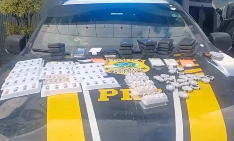 No porta-malas, os policiais encontraram dezenas de ampolas de um medicamento de uso controlado, indicado para tratar diabetes, mas também usado para emagrecimento. A busca detalhada revelou ainda 104 ampolas da substância, 69 celulares, 24 relógios inteligentes, além de eletrônicos, cosméticos e bebidas. Parte da carga estava escondida em compartimentos do painel.