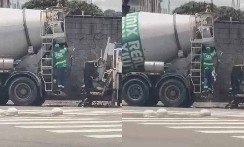 Fiscalização flagra funcionário da Real Mix lavando caminhão betoneira e despejando resíduos diretamente em sarjeta ligada à rede pluvial