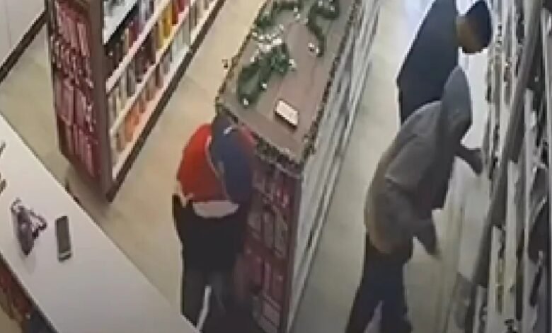 Imagens das câmeras de segurança mostram que os suspeitos entraram no estabelecimento se passando por clientes. Dois deles chegaram a testar perfumes importados, enquanto o terceiro observava a movimentação. Assim que uma cliente entrou na loja, o trio anunciou o assalto, levou as vítimas para os fundos e roubou os celulares. Em seguida, os criminosos trancaram a porta e começaram a colocar os produtos em mochilas e sacolas.