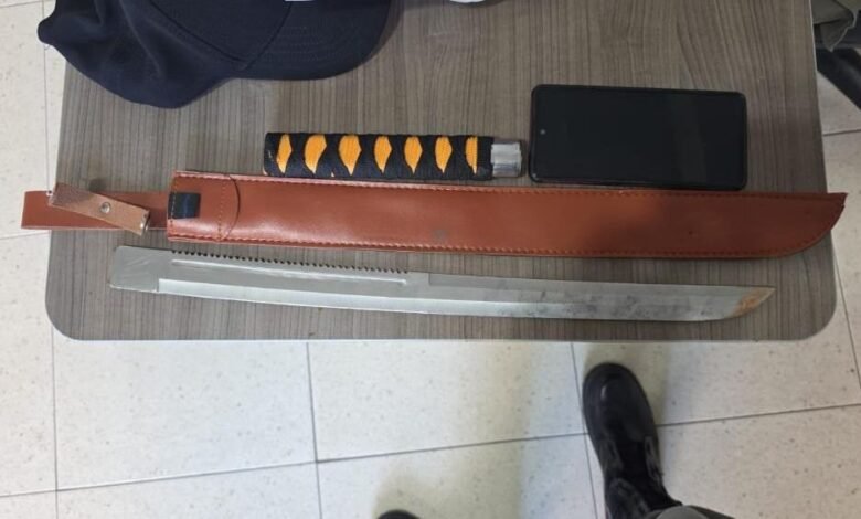 Segundo a corporação, o suspeito usou força física e arremessou um objeto, o que causou lesões na vítima. Em seguida, ele pegou uma faca e uma espada e passou a ameaçá-la.