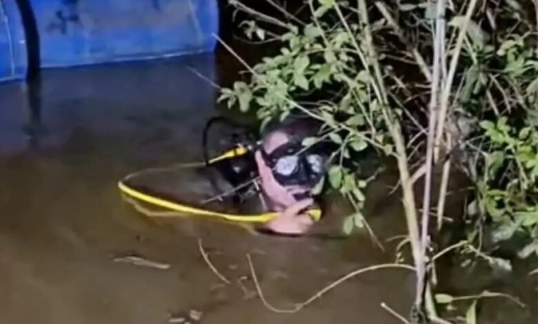 Correnteza forte, água turva e galhadas submersas dificultam buscas por rapaz de 22 anos