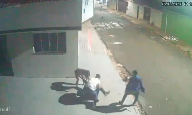 Câmeras de segurança mostram o momento em que o grupo cerca a vítima na rua. O amigo também sofreu agressões, mas conseguiu fugir.