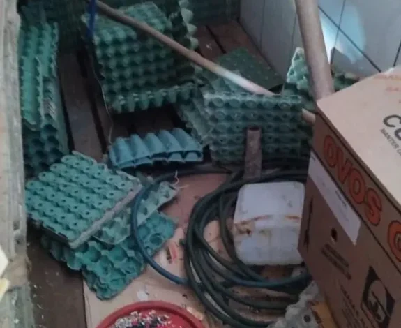 Durante a fiscalização, os agentes flagraram o responsável pelo imóvel enquanto ele carregava uma caminhonete com caixas de ovos destinadas a mercearias da região. O transporte, porém, ocorria sem refrigeração, sem higiene e sem qualquer controle sanitário, o que colocava consumidores em risco elevado de contaminação por doenças transmitidas por alimentos.
