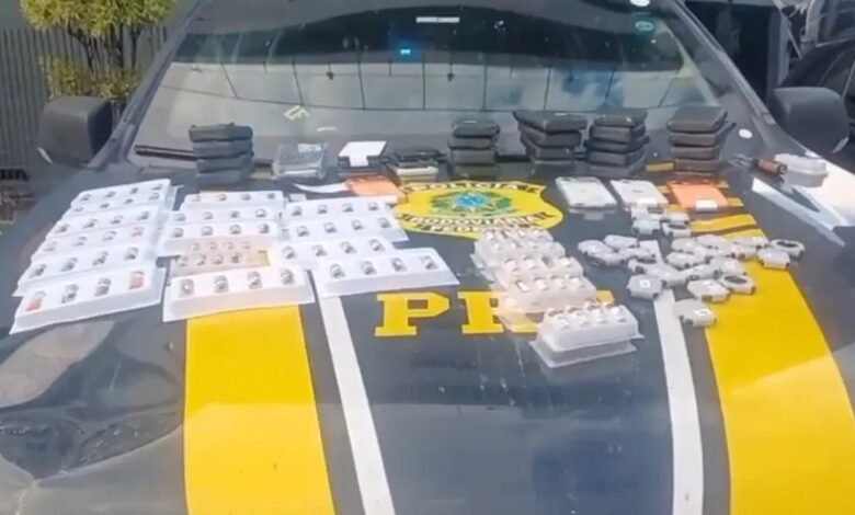 Os agentes decidiram aprofundar a fiscalização após perceberem contradições nas respostas dos dois ocupantes do veículo. No porta-malas, a PRF encontrou ampolas de um medicamento de uso controlado, utilizado para tratar diabetes e também empregado para emagrecimento. Na busca minuciosa, os policiais localizaram 104 ampolas, além de 69 celulares, 24 relógios inteligentes, cosméticos, bebidas e outros eletrônicos, muitos deles escondidos em compartimentos ocultos no painel.