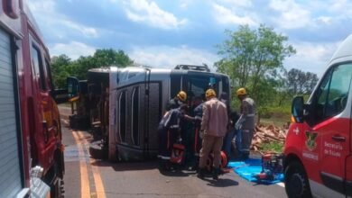 Caminhão tomba e motorista fica preso às ferragens na GO-341, em Mineiros