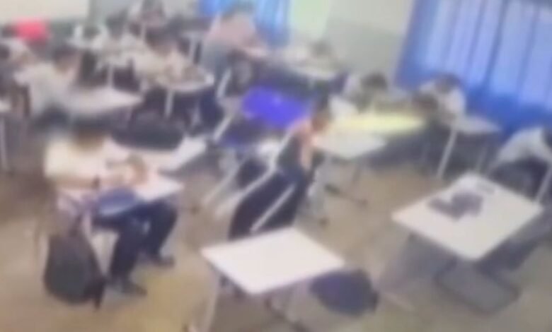 As imagens mostram o momento em que o estudante se aproxima da vítima, que estava sentada de costas, e a golpeia na cabeça com a cadeira. O ataque foi tão rápido que o colega não teve tempo de reagir. Após a agressão, o jovem deixou a sala enquanto a professora e outros alunos tentavam socorrer o ferido.