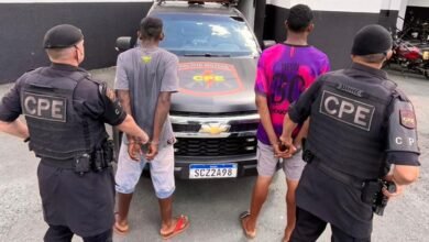 Motociclista reage, pede para o policial “segurar a onda” e diz que ele está “doidão”. O homem rebate em tom de ameaça: “Se filmar, eu vou comer na porrada. Onde eu tô doidão? Vamos resolver. Aqui é polícia. Qual é? Quem quer entrar em uma aqui? É na porrada? Quem quer na porrada?”.